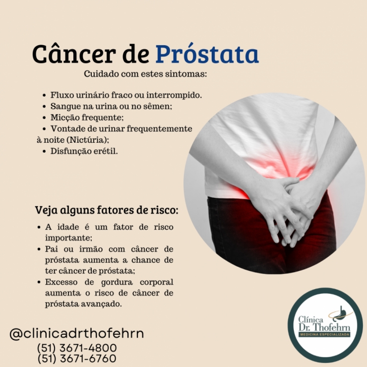 Em sua fase inicial, o câncer da próstata tem evolução silenciosa. Na fase avançada, pode provocar dor óssea, sintomas urinários ou, quando mais grave, infecção generalizada ou insuficiência renal.